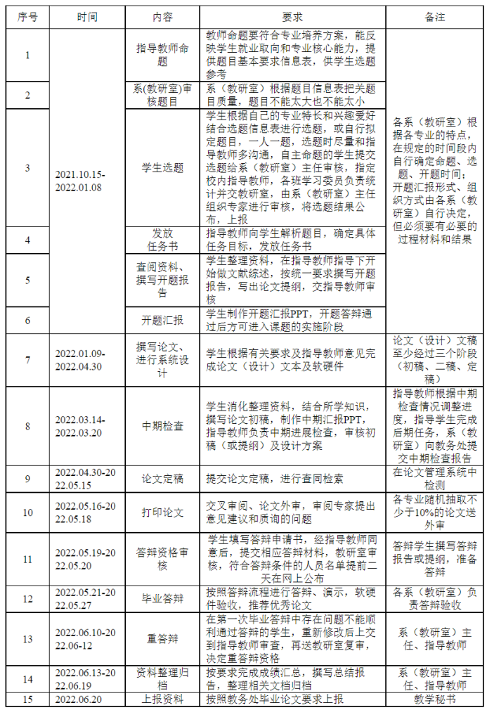 毕业论文(设计)是本科教学最重要的实践教学环节,pa电子官方网站2022届本科毕业论文(设计)的各项工作将在2021年10月~2022年6月期间完成,为更好地开展这一极为重要的实践环节,按照《pa电子官方网站本科生毕业论文工作流程》要求,现就2022届毕业论文(设计)相关工作布置如下,请各系(教研室)仔细阅读并认真执行。