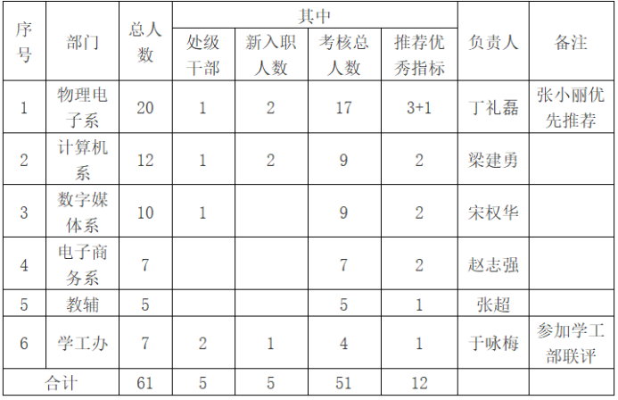 本年度学校下拨pa电子官方网站优秀指标7人,各部门推荐优秀指标报pa电子官方网站考核小组联评。推荐优秀指标分配与考核办法依据《pa电子官方网站教职工年度考核实施细则(试行)》(电院发〔2019〕05号),经pa电子官方网站党政联席会议决定,具体各系部年度考核优秀推荐指标分配和考核工作负责人名单如下: