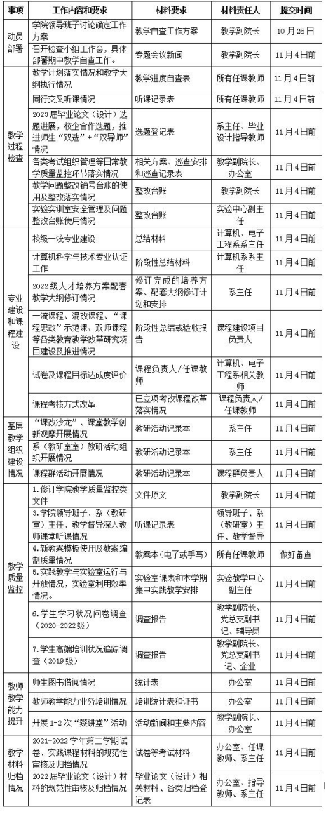 10月26日-11月4日,学院开展自查,根据教务处的通知要求和本方案逐项对相关材料进行检查,对未完成或不合格的项目敦促责任人限期改进和完成。